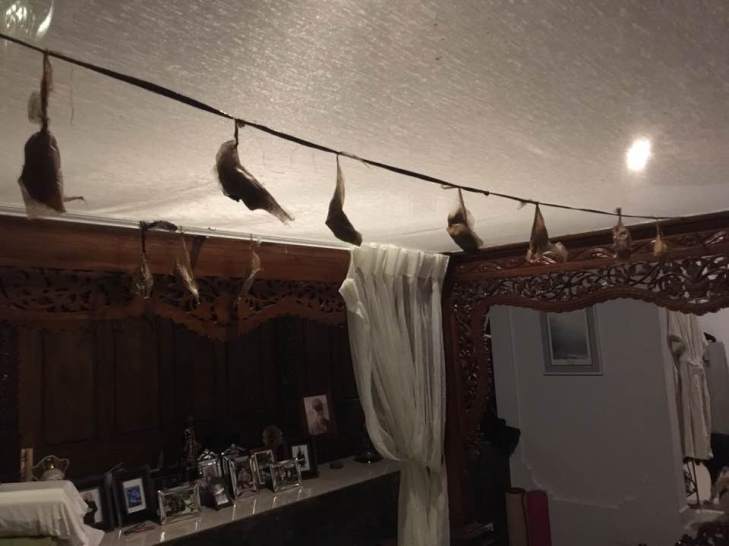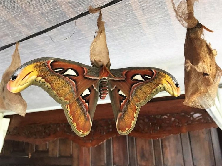 They’d found a colony of Atlas moth caterpillars in the bushes, which had turned into chrysalises. Atlas moths are the biggest moths on the planet, and can grow up to the size of a dinner plate. Craig told us the whole life cycle and reproductive history of the Atlas moth. There were 80 chrysalises, and Craig and Val had adopted a few and kept them in their bedroom strung across their canopy bed waiting for the new moths to emerge.