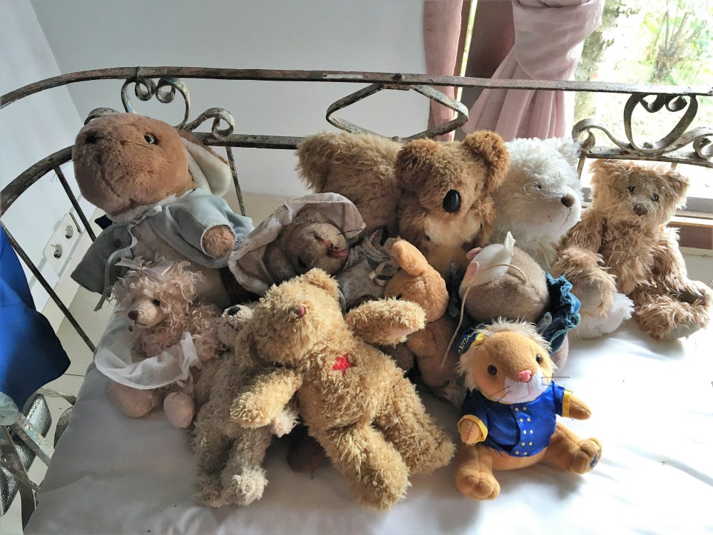 While wary of the moths, I was more attracted to a lovely antique crib filled with this adorable collection of old teddy bears. The bears had belonged to Val’s five sons, and might be to passed on to the next generation one day.