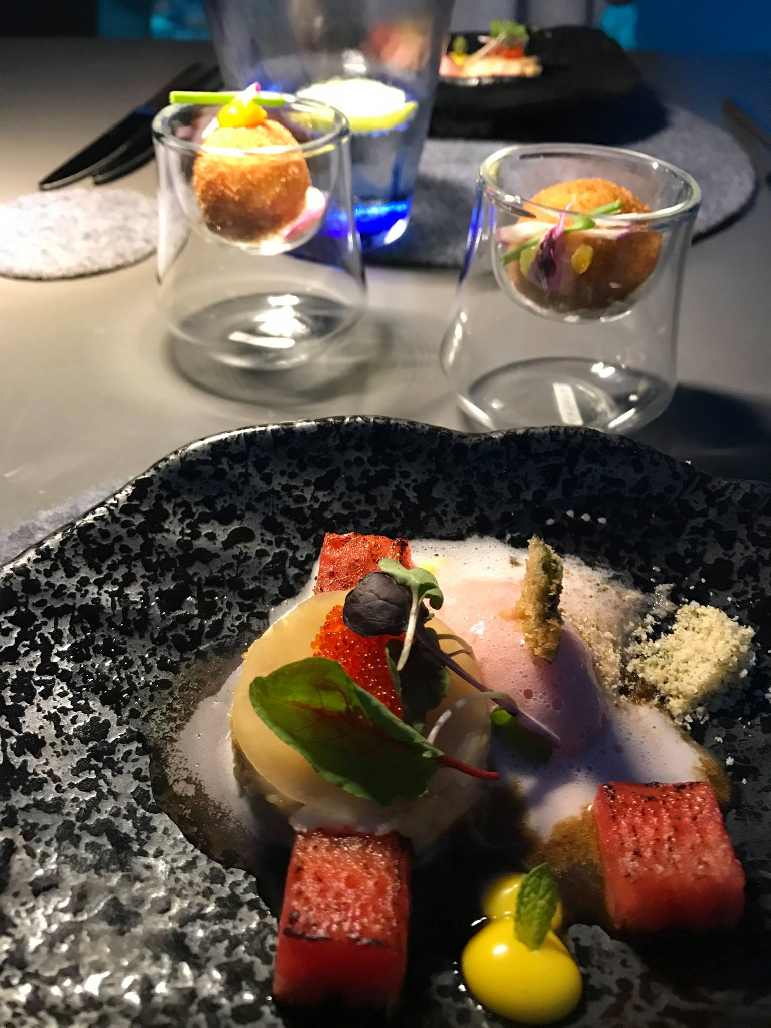 Our dinner was scheduled at 6.15 p.m. while sunset was on the wane, so we could see the water change from day to night through the course of the meal. Night time and the restaurant’s lights brought the big fish like barracuda and tuna to swim around the dining room’s glass dome. With a 9-course dinner including truffles, wagyu beef, and foie gras among its lavish ingredients, plus the theatre of fish swirling all around us, the whole dining experience was a full-on 360-degree sensory experience.