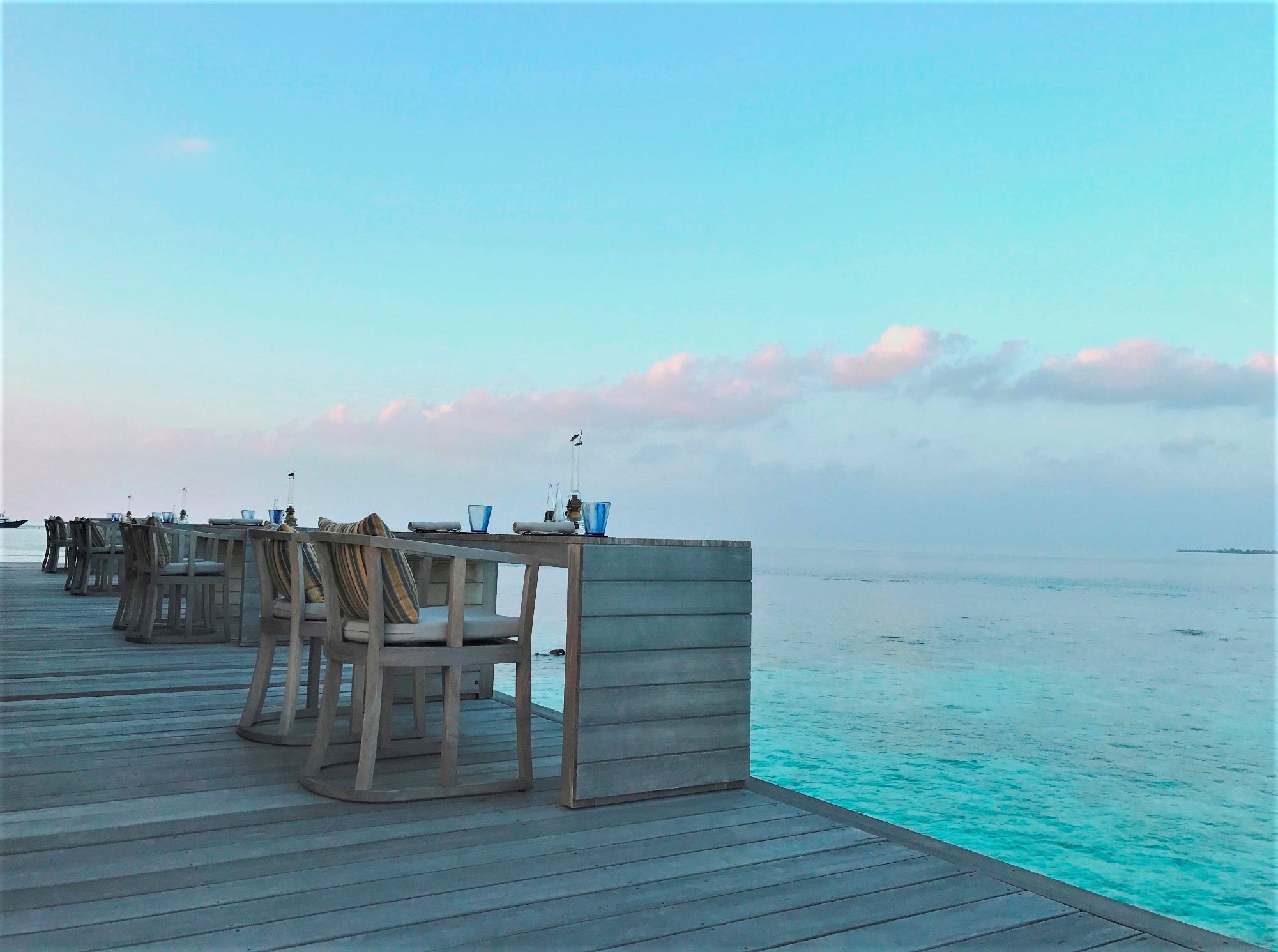The overwater villas fan out from a long pier, with a special destination at the end of the pier – the sunset champagne bar, situated to offer perfect, dreamy views of romantic seaside sunsets.