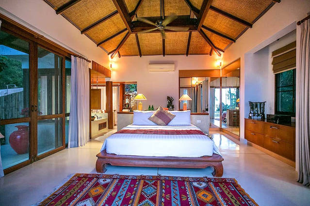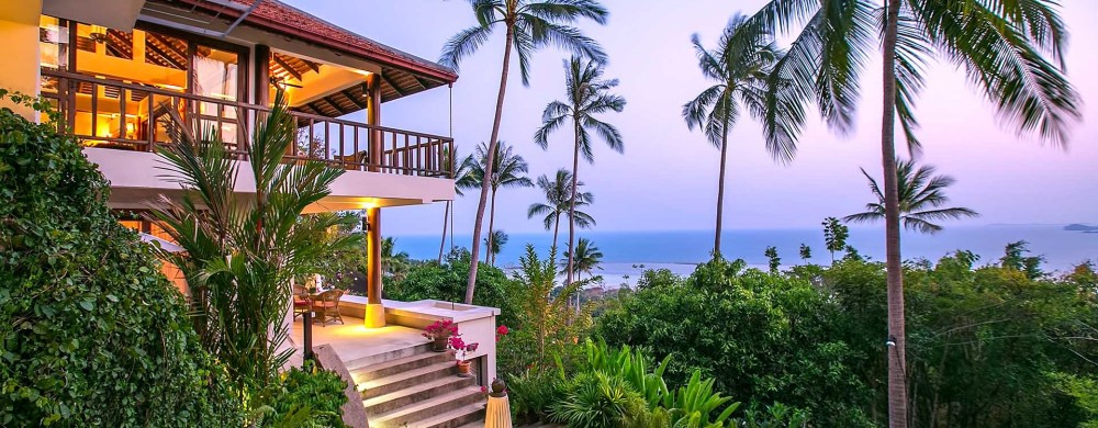 Frederique’s stunning villa is located on Koh Samui Island off the Southern Thailand coast in the Gulf of Thailand. Built in tropical style that merges indoor with outdoor living, the villa is located on a hillside offering panoramic ocean views, coconut trees and lush gardens.