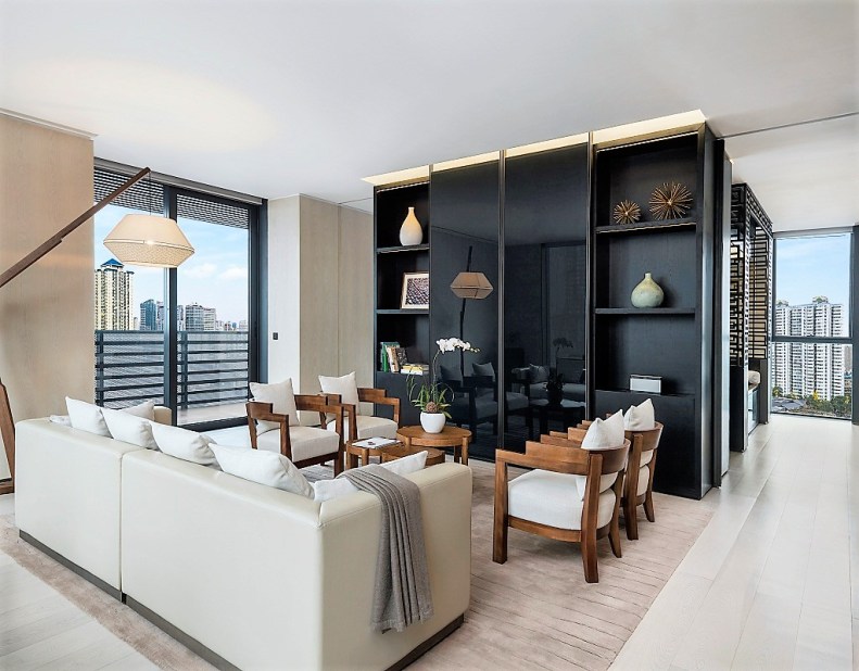 The hotel is built around three historic houses which comprise the main entrance lobby, and Mi Xun Teahouse and Spa, while two contemporary towers house the residential apartments and hotel rooms respectively.