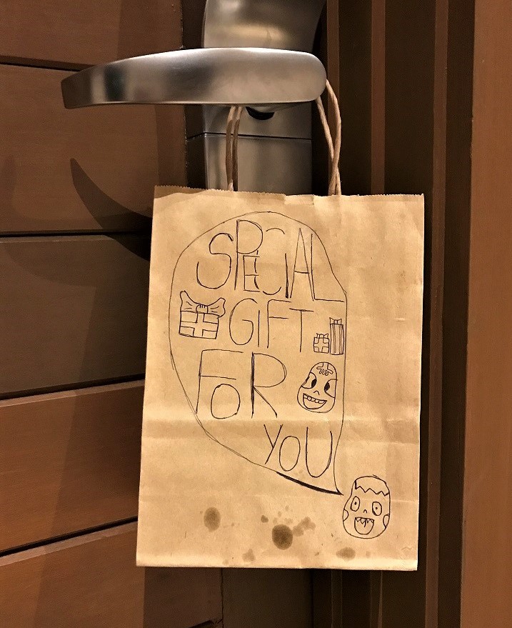 After dinner that night I returned to my villa to find a surprise gift hanging on my door. The spa had sent over a bag of cookies and an adorable note with cute hand-drawn cartoons of me (“where are my cookies?”) and Mr. Barefoot (“where’s my phone?”), signed by Milk and Juice – pronounced “Miw?” and “Juwiss?” in Thai – which were the names of the spa girls, not ingredients in the cookies. How sweet! (their kindness, not the cookies).